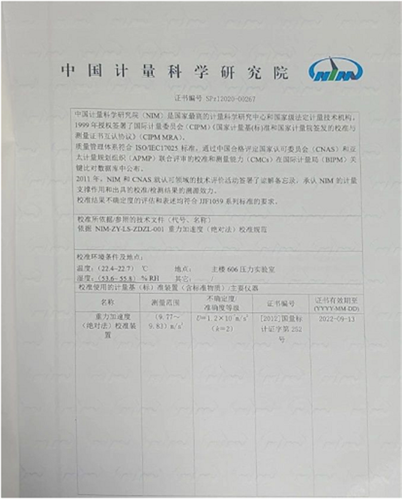 我們以創(chuàng)威公司廈門某客戶為例。2020年,廈門某技術(shù)機(jī)構(gòu)購買了創(chuàng)威公司3臺0.005級的活塞式壓力計,其中有1臺氣體真空活塞式壓力計、2臺全自動活塞式壓力計,量程區(qū)間為-0.1~60MPa。同時全權(quán)委托創(chuàng)威公司對其實驗室進(jìn)行重力加速度的實地測量,并出具國家機(jī)構(gòu)的測試校準(zhǔn)證書。